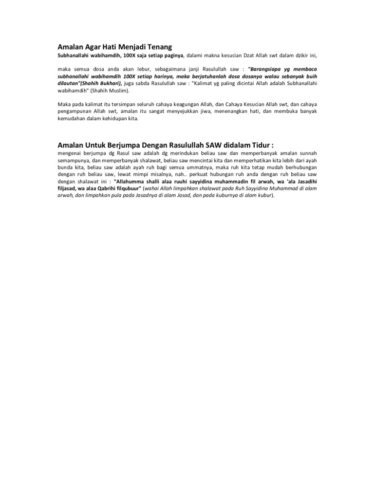 Semasa saya sedang mengalami keserabutan dulu, saya mengamalkan membaca surah yassin setiap kali selesai solat. Amalan doa, dzikir, zikir, dan wirid untuk mengabulkan dan mendatangkan segala hajat agar supaya terkabul dan diberikan kemudahan segala urusan di dalam menghadapi masalah, amalan ampuh hajat mendesak, amalan asmaul husna agar hajat terkabul, amalan asmaul husna untuk hajat, amalan asmaul husna untuk segala hajat, amalan ayat kursi untuk hajat, amalan ayat kursi untuk segala hajat, amalan. Oleh itu marilah kita kembali menghidupkan amalan ini. Berhentilah sejenak dari kemelut dunia, bebaskanlah diri beberapa saat dari kecamuk urusan atau pekerjaan! Sebaiknya amalkan enam cara ini untuk menenangkan hati anda dilansir dari laman dalamislam.com, senin (20/7/2020). Zikir itu bukan hanya amalan lisan melainkan juga menenangkan pikiran dan menyejukkan hati. Dzikir dan istigfar dapat menenangkan hati dan pikiran. Itu semua tidak bisa kita prekdisikan. Terdapat dua amalan wirid dzikir yang dapat dilakukan agar hati menjadi tenang, pertama dzikir hasbunallah wa ni'mal wakiil dan kedua, dzikir la haula wala quwwata illa billah. Sebagai makhluk yang dibekali keimanan, manusia akan cenderung mengingat allah swt saat merasa sedih atau putus asa. Untuk itu ada anjuran amalan khusus dan doa agar hati lebih merasakan kedamaian, jauh akan kekhawatiran. Pemikiran yang waras akan memandu kita untuk membuat keputusan dan pilihan yang betul. Ini juga menjadi amalan penenang hati, karena faedahnya adalah mendapatkan hati yang tenang.